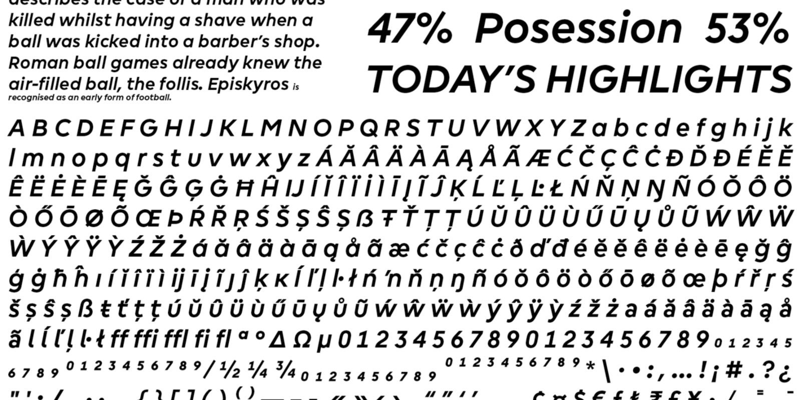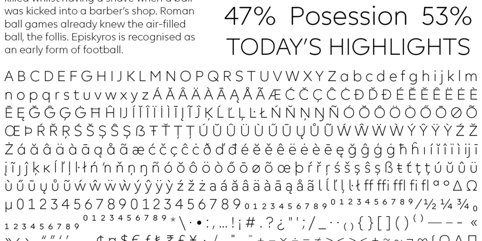 縦画の上部にわずかな角度を加えることで、この書体は他のジオメトリック・サンセリフと一線を画すデザインとなりました。特に数字には重点が置かれ、時計表示やリーグ表、その他の画面上でも明確に見分けられるようにデザインされています。