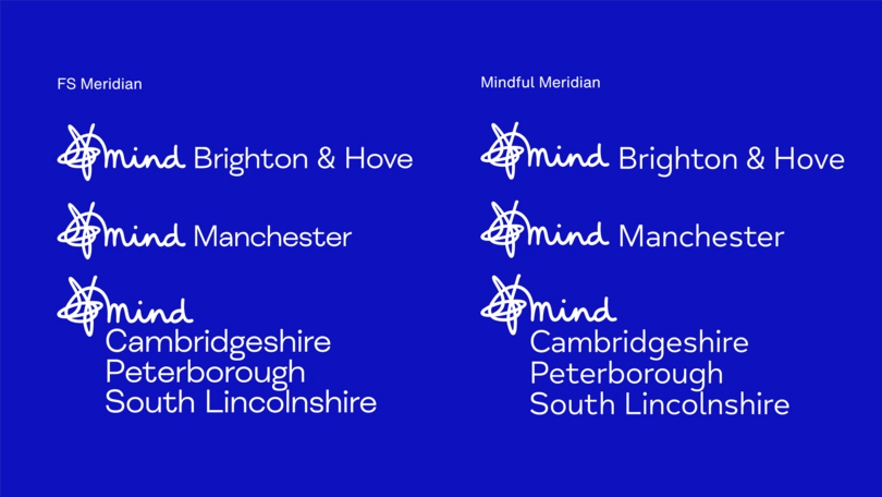 The organisation’s new typeface was designed to harmonise with this refreshed branding, retaining the vitality of the Mind squiggle while answering the functional needs of the organisation – in particular the accessibility requirements. Mind Meridian is legible for those with visual impairments, and has been tailored to sit comfortably alongside the local, handwritten executions of the organisation’s logo.