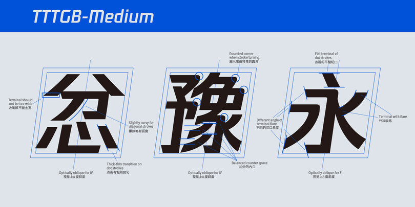 “For the conflict between Chinese characters and the slanted style, we applied many optical corrections to each character to make it comfortable for our eyes, and natural,” says Hu