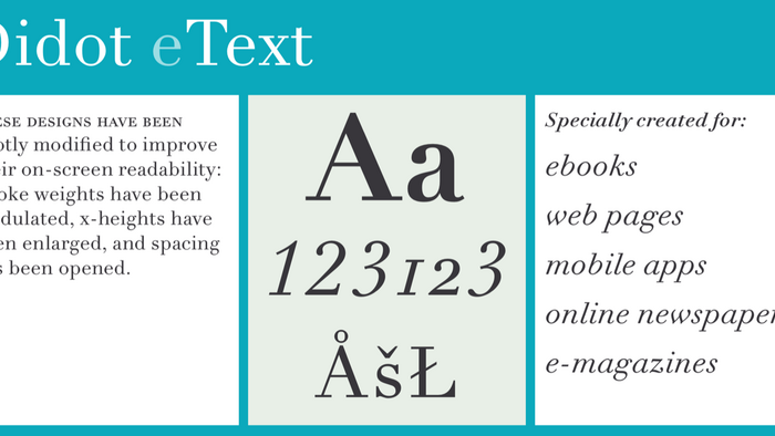 If you find Didot’s traditional weights to be too light or sharp for digital work, try the eText versions which are beefed-up and tuned for text on screen.
