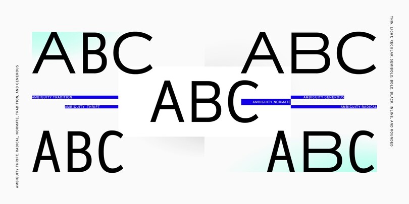 With this in mind, Nix started playing with the proportions of letterforms. He deliberately reversed and recombined traditional proportions to challenge his own bias. The exploration ultimately led to five different ‘states’ for Ambiguity—Tradition, Radical, Thrift, Generous and Normate. Together they offer a variety opportunities to explore the interaction of typographic form and content.